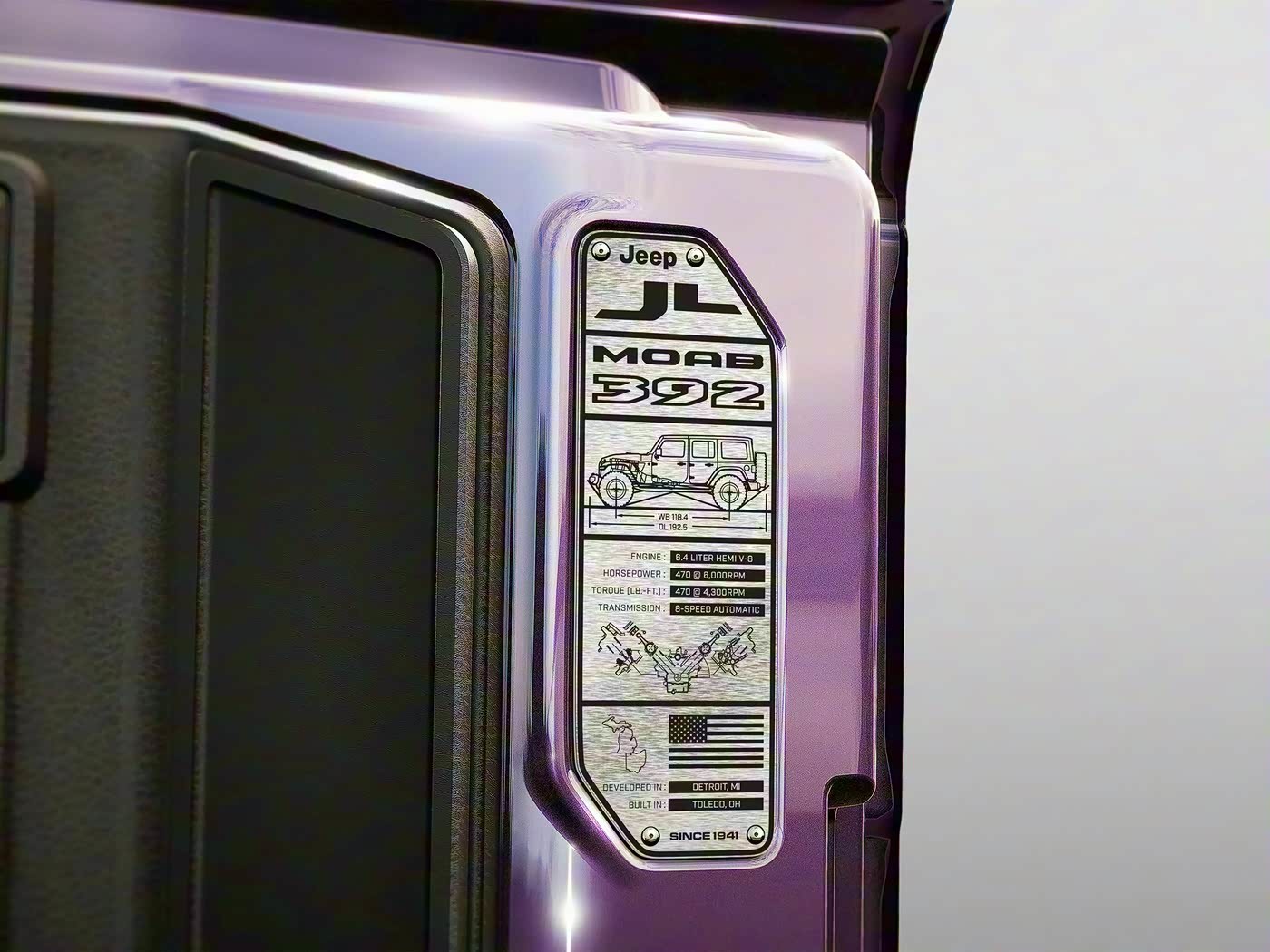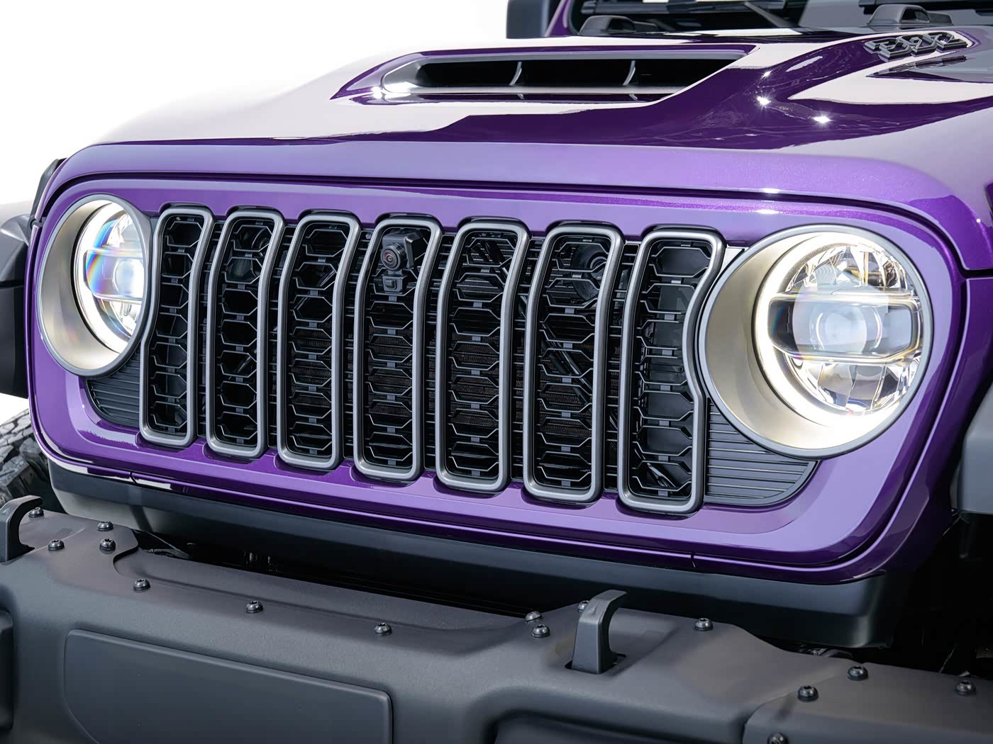 外观方面,新车外观采用车身同色的硬顶设计,机舱盖上的凸起是为6.4升Hemi发动机预留的空间,凸起前方设计了散热开口,前后包围、轮眉、拖车钩、侧裙采用纯黑配色,侧踏板为纯钢材质,与17英寸轮圈搭配的是35英寸全地形轮胎。