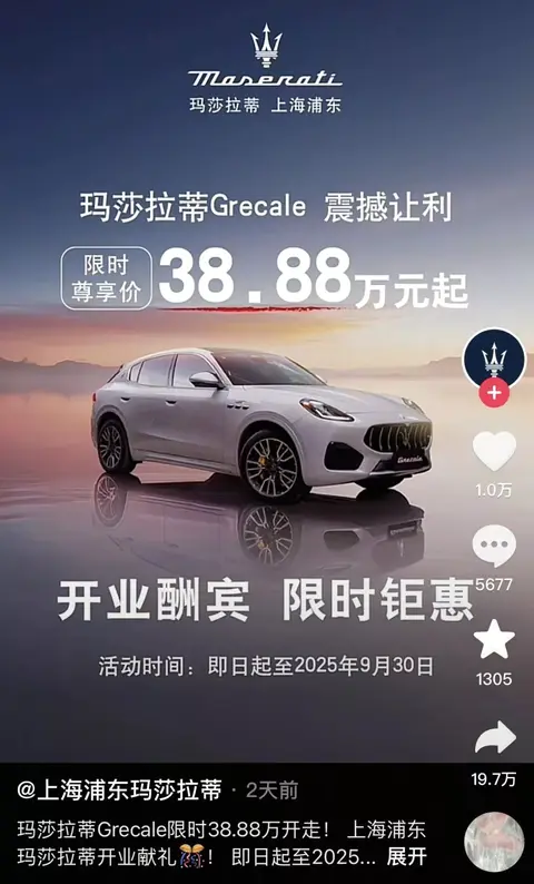 今年7月,上海一家玛莎拉蒂经销商发布海报称,Grecale燃油版本限时尊享价38.88万元起。而该款车型的指导价在65.08万元—103.88万元之间,降幅超过26万元。