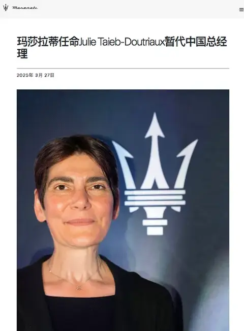 玛莎拉蒂官网显示,2023年5月,朗博霆(Fabio Lambertini)出任大中华区新任董事总经理,负责品牌在中国的总体业务运营。2024年9月,于瀚邦出任中国总经理一职,负责品牌在华的商业运营。不到一年,玛莎拉蒂再次宣布换帅。今年3月,任命朱莉(Julie Taieb-Doutriaux)暂代中国总经理,统筹负责品牌在华的业务运营。