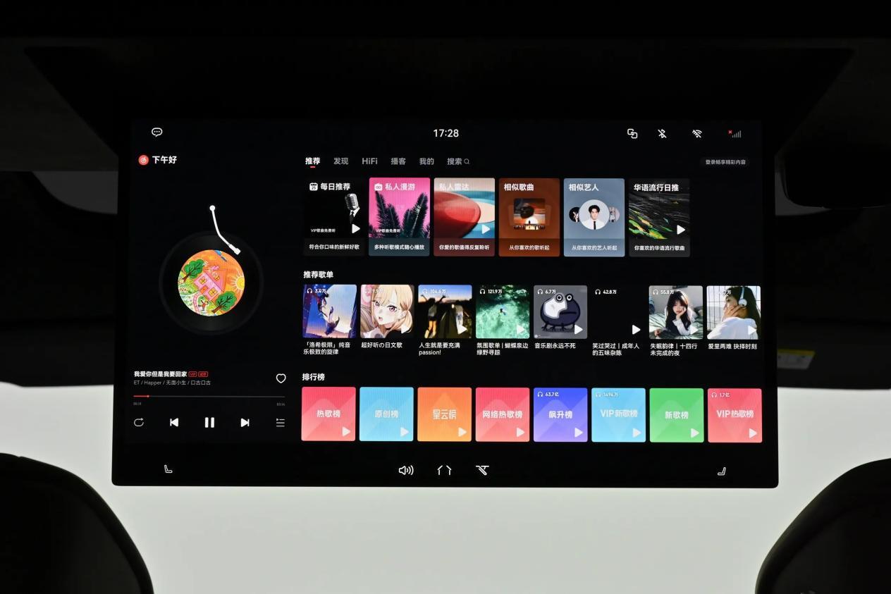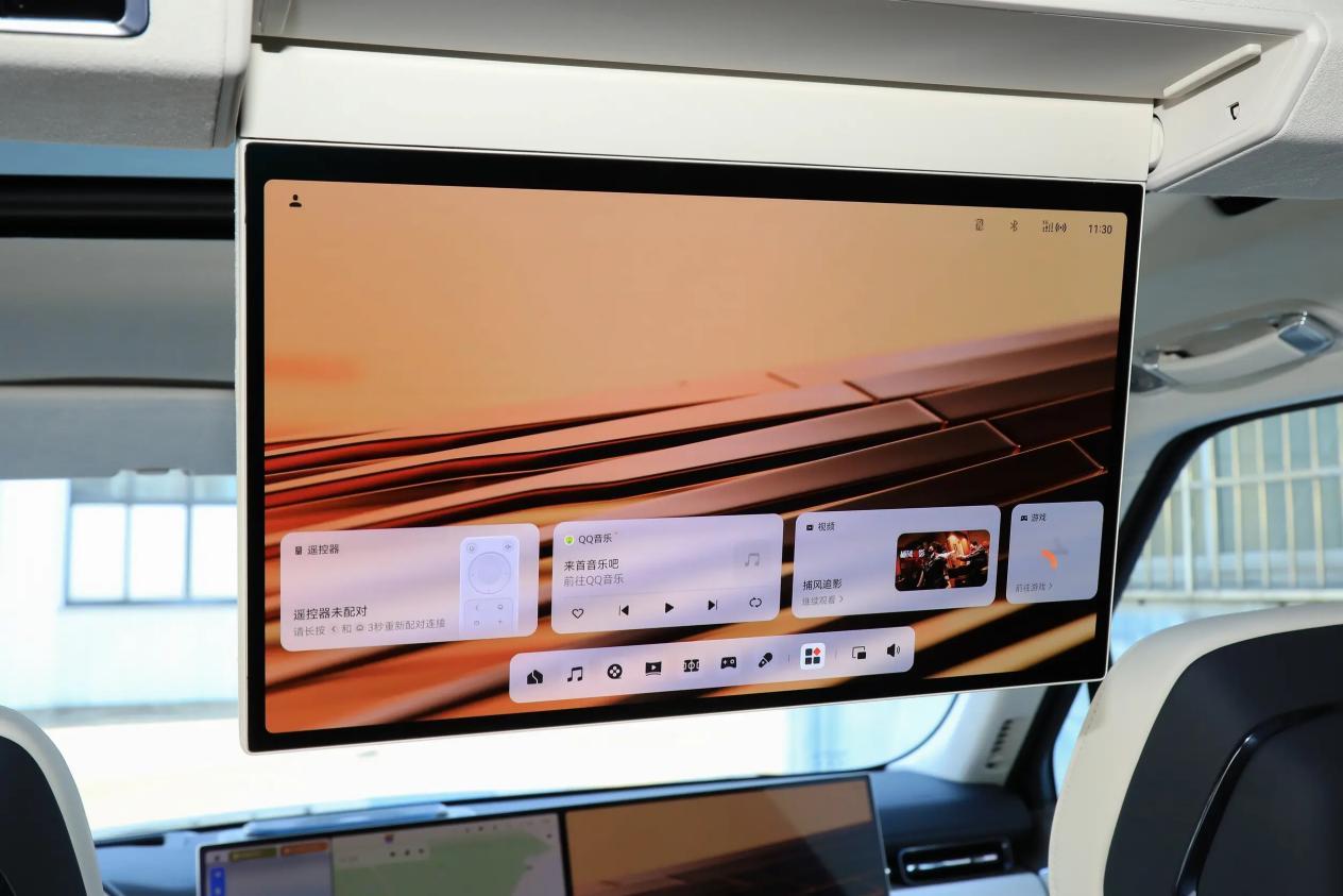 极氪9X的内饰没有单独设计,而是品牌一贯的风格,2块16英寸屏幕营造科技感,双拼内饰用了Soft NAPPA全粒面头层真皮包覆,并带有实木饰板,质感相当不错。另外,它在后排还配备了一块可以滑动88cm的17英寸屏幕,同时匹配6.3英寸可取放的妙控屏幕,搭配2颗8295芯片,完全可以满足未来5年的系统OTA冗余。智能驾驶有点“抠”,只有高配是完整形态的千里浩瀚H9,用了5个激光雷达、2颗英伟达Thor-U芯片,算力1400TOPS,也能满足未来冗余。