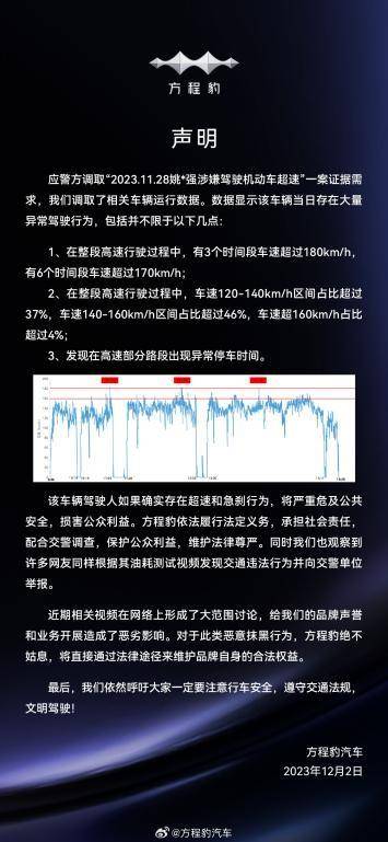 2023 年 12 月,方程豹豹 5 上市之际,姚*强通过抖音账号“大秦军陕团”发布视频,声称以正常驾驶方式测试方程豹旗下车型豹5,得出百公里油耗18升的结论,在网络上引起了大范围的关注及讨论。之后应警方调查取证需要,比亚迪调取数据显示:测试当日车辆存在大量异常驾驶行为,高速行驶过程中有3个时段车速超过180km/h, 有6个时段车速超过170km/h,在整段高速行驶过程中,车速120-140km/h区间占比超过37%,车速140-160km/h区间占比超过46%,车速超160km/h占比超过4%。