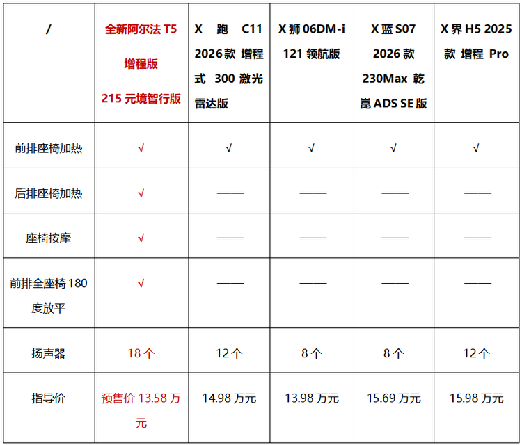 从年轻时尚外观设计到北汽神擎增程的硬核加持,从全系标配宁德时代电池到全球首个搭载骁龙8775舱驾一体解决方案,从麦格纳世界级品质到“近0醛0苯”健康座舱,全新阿尔法T5“一车满足全家需求”,让中级车“不再中级”,带给众多年轻家庭时尚动感、驾乘自由、智能舒适、可靠安全的SUV新体验。
