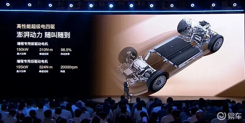 最后是动力方面,新车搭载奇瑞第三代鲲鹏超能混动 C-DM 系统,其由1.5T发动机+单电机后驱/双电机四驱组成的增程动力系统,其中发动机热效率为45.79%,系统综合功率为345kW,峰值扭矩634N·m,WLTC馈电油耗为6.1L/100km。