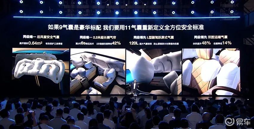 至于被动安全方面,新车全系标配11个安全气囊,包括后风窗安全气囊、2.2米超长侧气帘、L型附加跃屏式气囊,以及双腔远端气囊,其中2.2米超长侧气帘采用第二代6s保压技术,0.02s极速响应。
