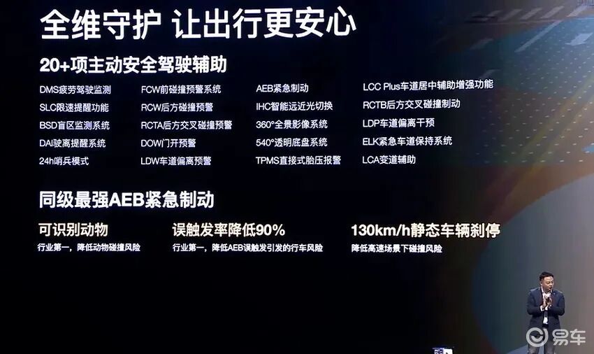 主动安全方面,新车全系标配AEB紧急制动,以及侧向开门预警等20+功能,其中AEB系统可识别行人、自行车等障碍物,极端天气下的识别能力也经过专项优化。