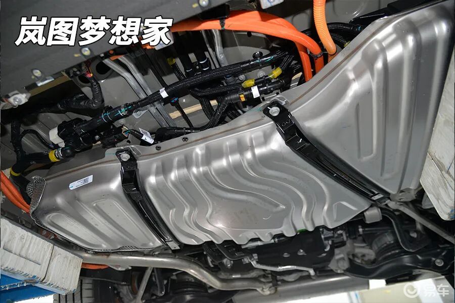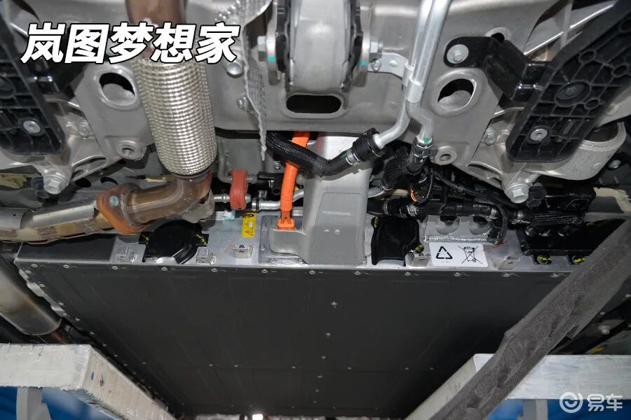 岚图梦想家的底盘一眼望去特别平整,显而易见是原生新能源平台,电池预留空间大,容量最大可达62.5千瓦时,端子由铸铝碗状结构包裹。电池前后均设防爆阀,底盘平整度、防护等级均优于GL8。