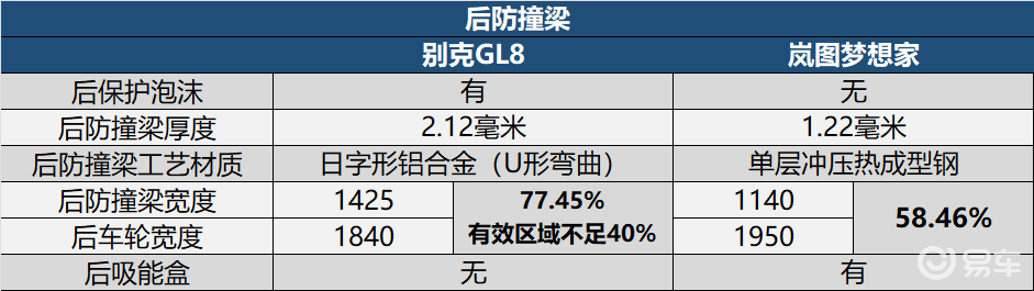 梦想家的后防撞梁是1.22毫米的高强度钢,带有标准的方形吸能盒,维修成本低,防护面积大于别克GL8。